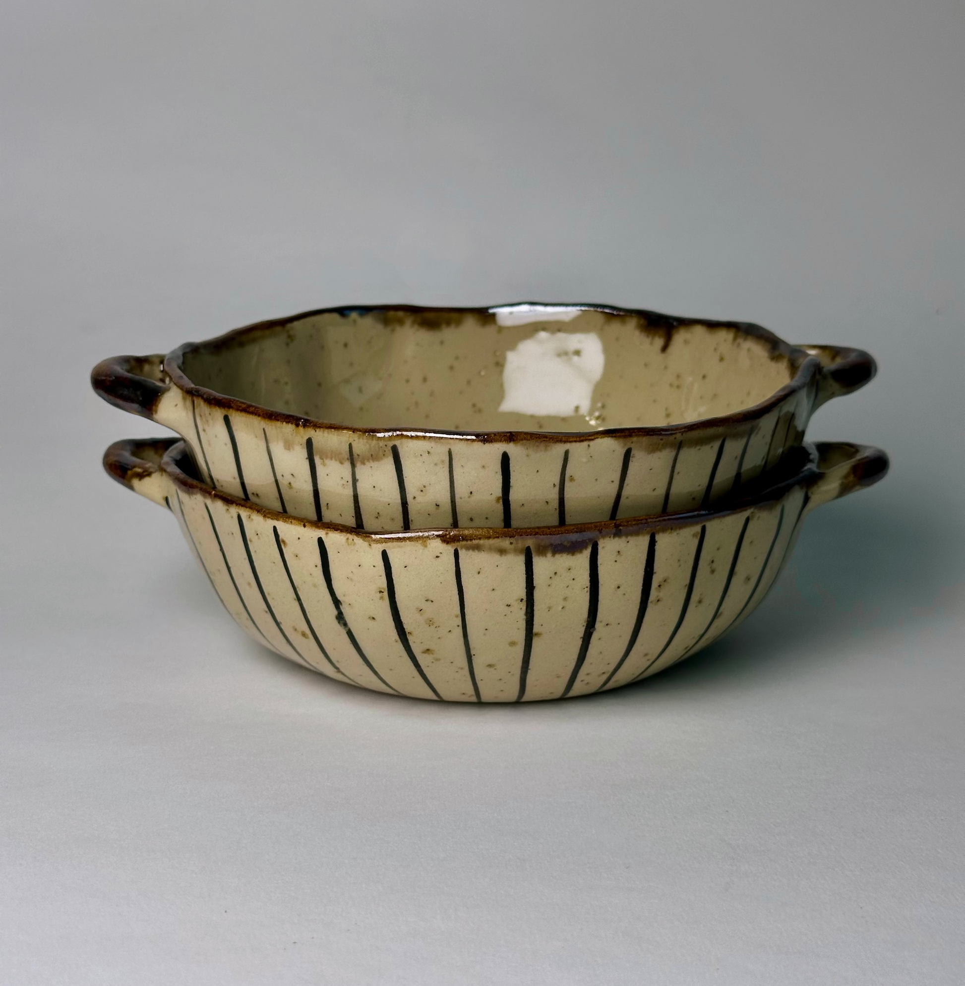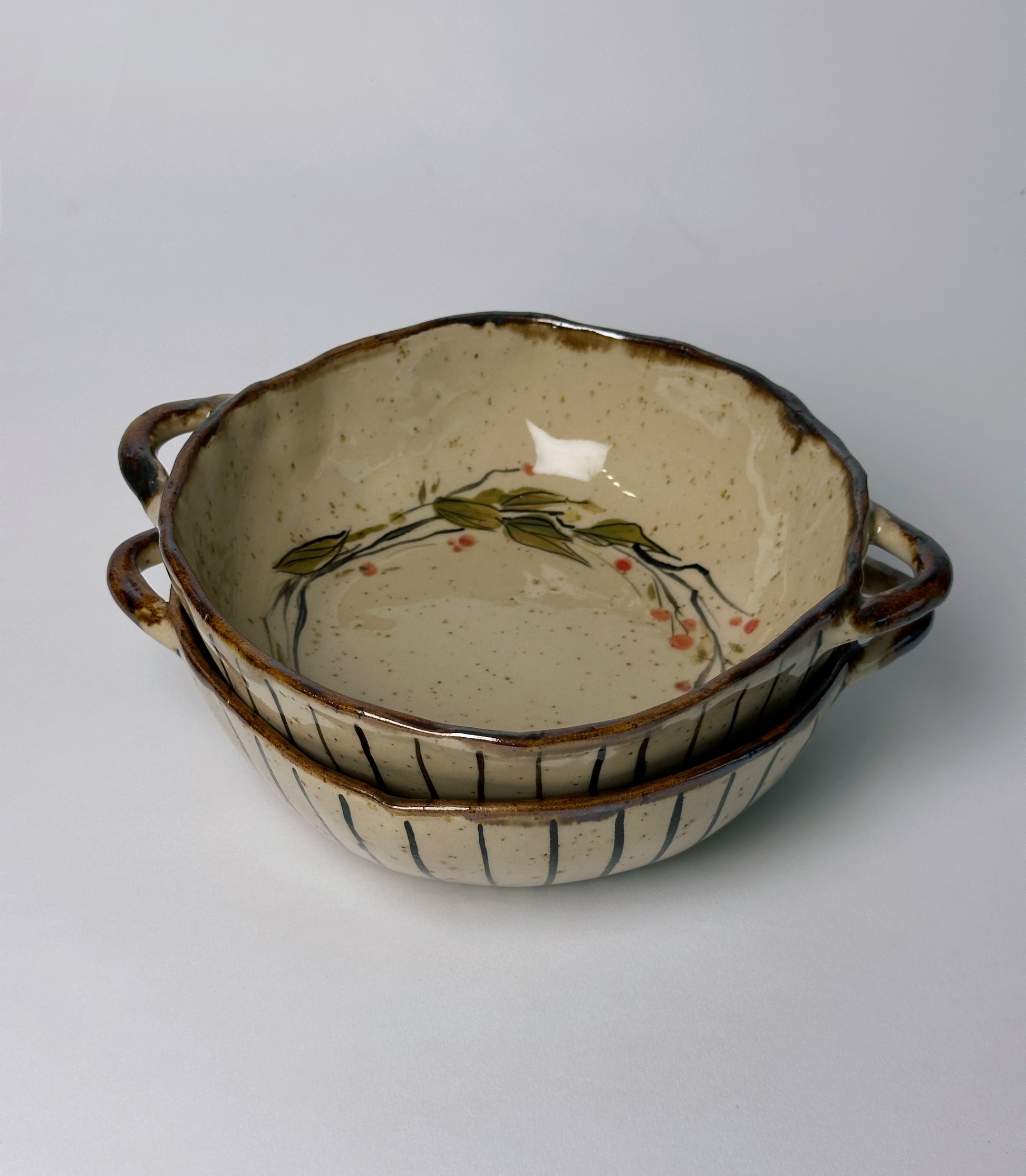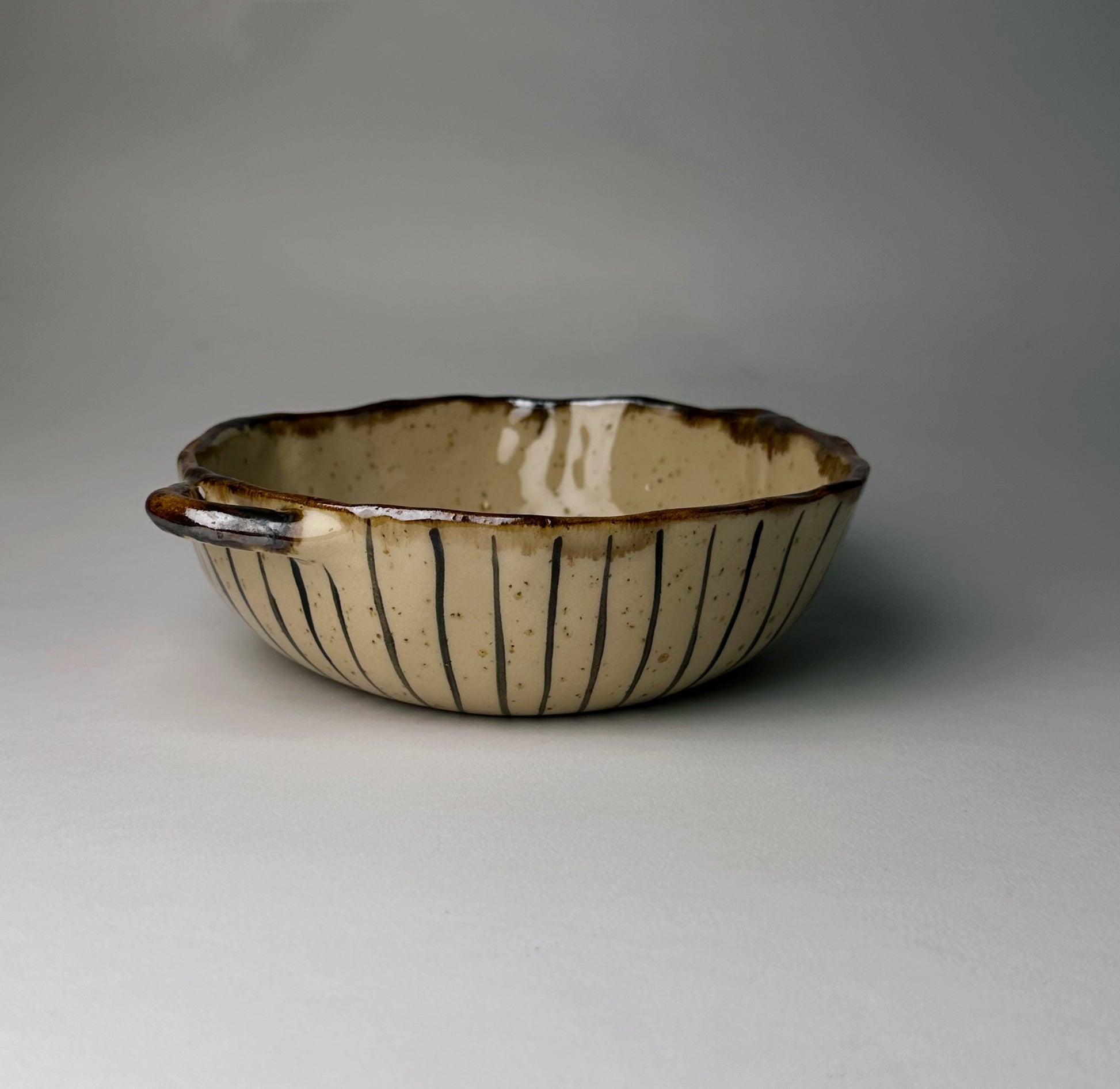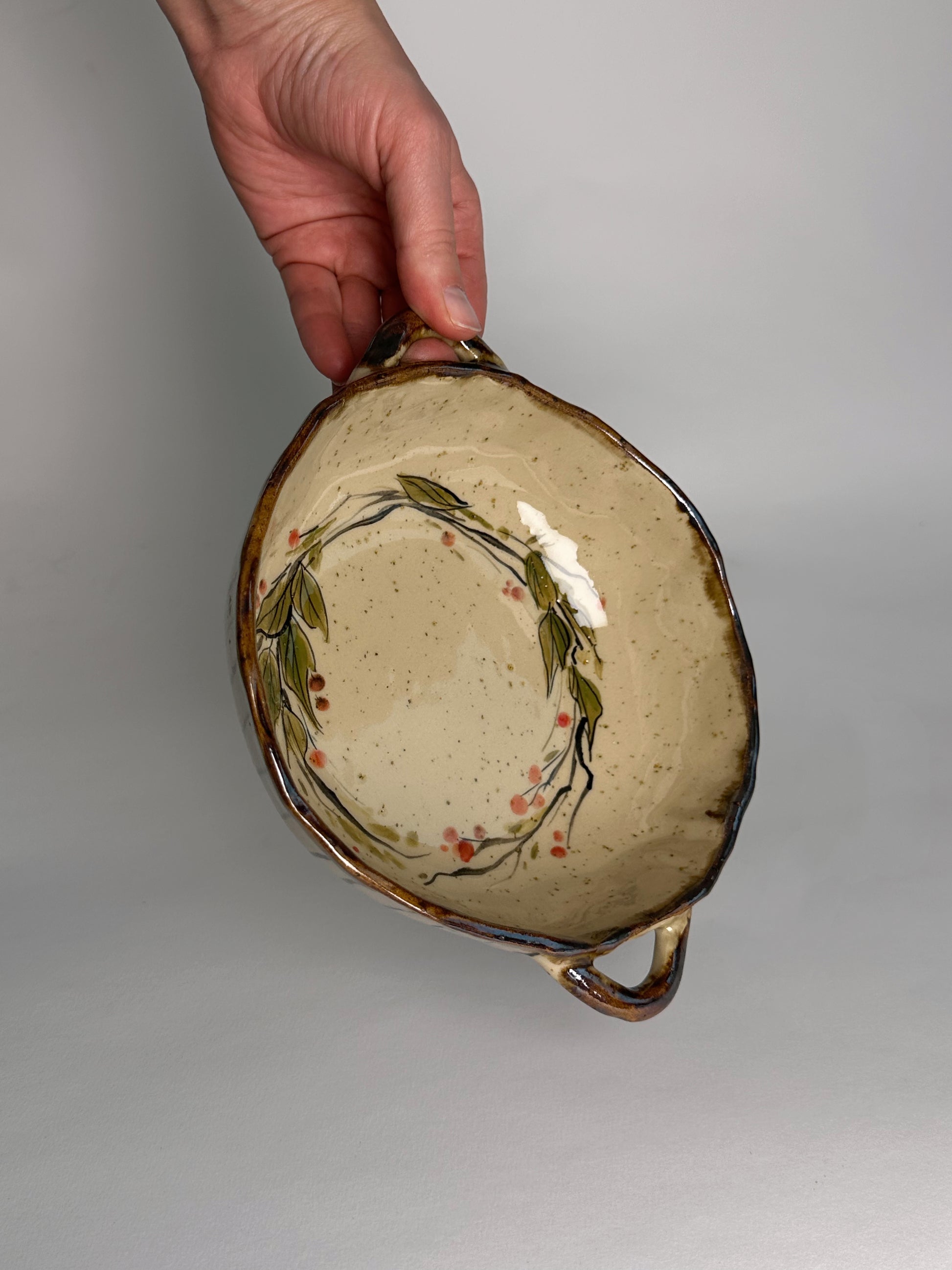 Ręcznie wykonana i ręcznie malowana miska ceramiczna z dwoma uchwytami. Lekko nieregularna krawędź — naturalny urok ręcznej ceramiki.